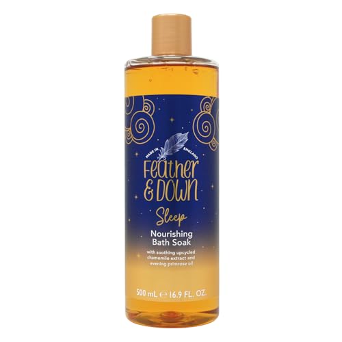 Feather & Down närande badtillsats (500 ml) – med lugnande förberett kamomillextrakt och nattljusolja. Ta hand om din kropp och lugna ditt sinne Inga djurförsök. Vegan