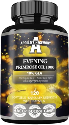 Nattljusolja 1000 mg med vitamin E - Innehåller 100 mg GLA-syra - 120 softgelkapslar - 4 månaders förbrukning - Kosttillskott för att stödja hormonell balans och hudhälsa - från Apollo's Hegemony