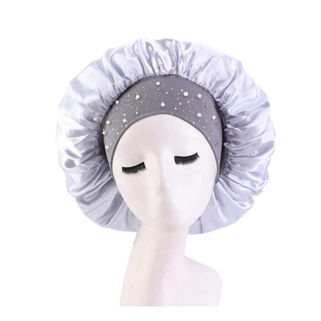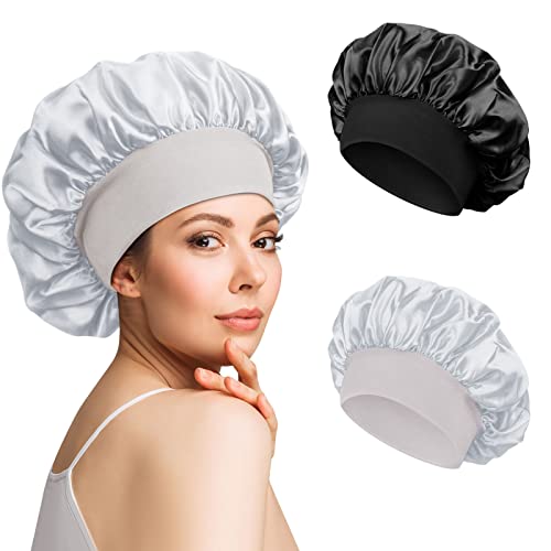 2 stycken sovmössor av satin, hätta, nattsömn, nattmössa, justerbar huvudbonad, mjuk huvudmössa, silke, med elastiskt band, för kvinnor och flickor (svart, silver)