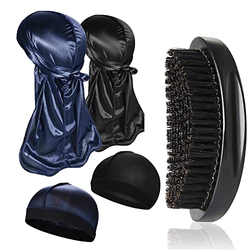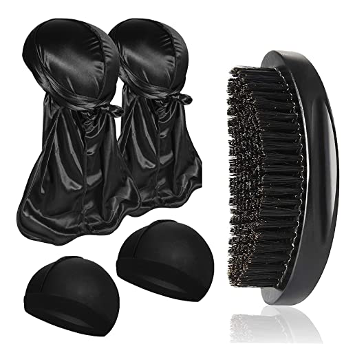 Furwabo Silky Durags, 2 stycken, med elastisk wave-mössa och wave-borste, unisex, nattmössa, doo-rag för waves, borstset, strumpa, kompressionsmössa för 360, 540 och 720 waves, svart, M