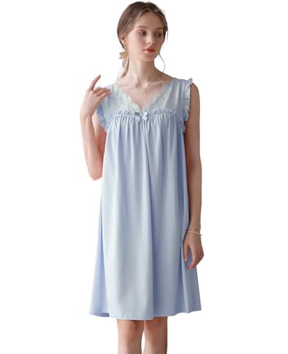 Litherday Nattlinne dam kortärmad sommarnattskjorta rund hals med spets nattskjorta dam kort bomull mjuk och bekväm nattskjorta, Blå, XL