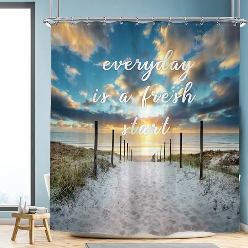 Riyidecor Havsstrand citat duschdraperi 152 cm B x 182 H cm kust solnedgång scenisk blå himmel inspirerande natur solljus landskap sand hav badrum dekor polyester vattentät 12-pack krokar