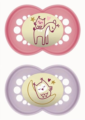 MAM Dummy av naturgummi, lyser i mörkret, från 6 månader, med symmetrisk napp, platt och flexibel, med självsteriliserande låda, ljusrosa, 2 stycken