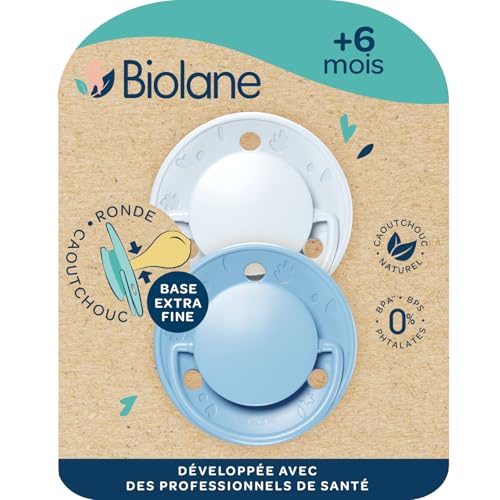 BIOLANE Runda dinappar - Extra fina nappar - 6+ månader och uppåt- Tvåfärgad blå - napp i naturgummi - Respekt för munutveckling- Mjuka och bekväma - Förnybara material