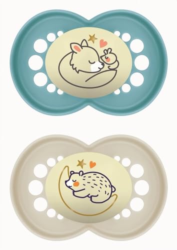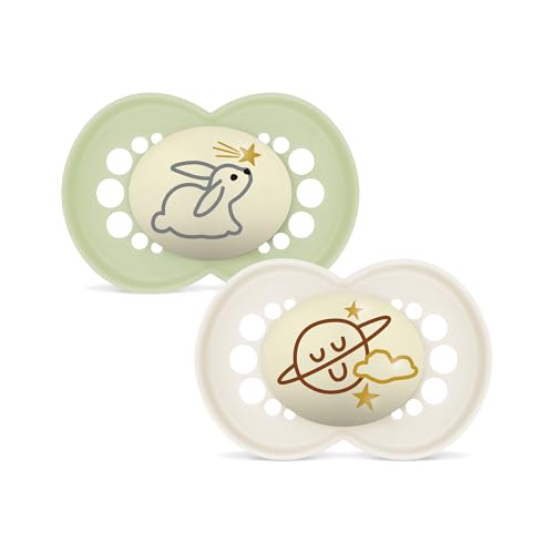 MAM Dummy av naturgummi, lyser i mörkret, från 6 månader, med symmetrisk napp, platt och flexibel, med självsteriliserande låda, neutral matt, 2 stycken