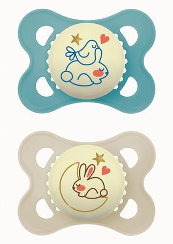 MAM Dummy av naturgummi, lyser i mörkret, 2–6 månader, med symmetrisk napp, platt och flexibel, med självsteriliserande låda, mattblå, 2 stycken