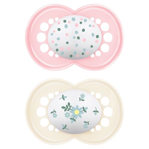 MAM Dummy av naturgummi, lyser i mörkret, från 6 månader, med symmetrisk napp, platt och flexibel, med självsteriliserande låda, matt rosa, 2 stycken