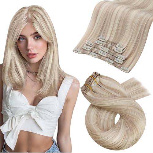 Cybelleza 50 cm naturlig hårförlängning med klämmor, 6 band, vågiga, lockiga hårförlängningar, syntetiskt hår, clip-hårförlängning, långa hårförlängningar, naturlig blond och blekblond