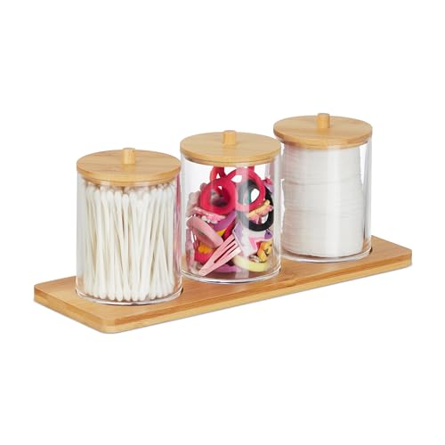 Relaxdays bomullspinnbehållare med bricka, 3 koppar med lock, kosmetisk arrangör plast/bambu, transparent/naturlig