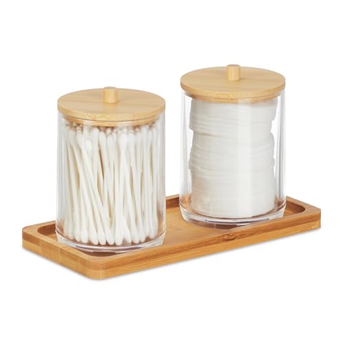 Relaxdays bomullspinnbehållare med bricka, 2 koppar med lock, kosmetisk arrangör plast/bambu, transparent/naturlig