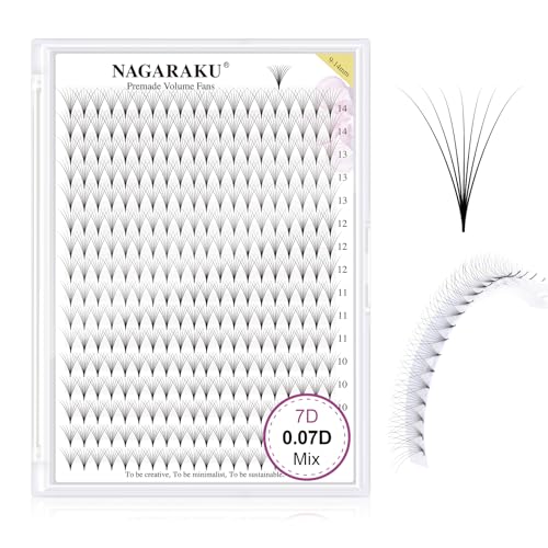 NAGARAKU 7D Förgjorda Volymfransar 320 Fans Volym Premade Fans Lång Stjälk Tunn Bas Spets Naturliga Fluffiga Fächer Fransar Fransförlängning Ögonfrans Ryska Svart 16 Rader Box XL (0.07 D 9-14mm)