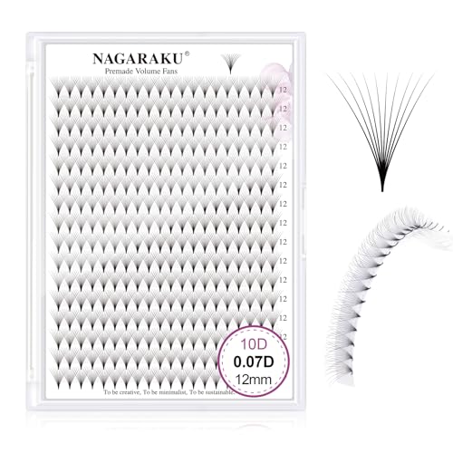 NAGARAKU 10D Förgjorda Volymfransar 320 Fans Volym Premade Fans Lång Stjälk Tunn Bas Spets Naturliga Fluffiga Fächer Fransar Fransförlängning Ögonfrans Ryska Svart 16 Rader Box XL(0.07 D 12mm)