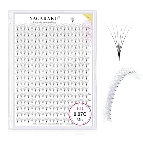 NAGARAKU 6D Förgjorda Volymfransar 320 Fans Volym Premade Fans Lång Stjälk Tunn Bas Spets Naturliga Fluffiga Fächer Fransar Fransförlängning Ögonfrans Ryska Svart 16 Rader Box XL (0.07 C 9-14mm)
