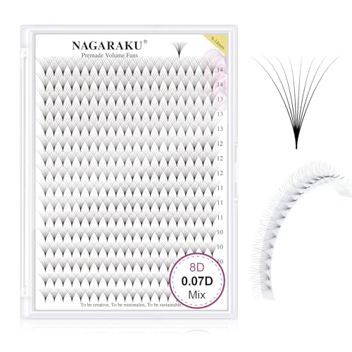NAGARAKU 8D Förgjorda Volymfransar 320 Fans Volym Premade Fans Lång Stjälk Tunn Bas Spets Naturliga Fluffiga Fächer Fransar Fransförlängning Ögonfrans Ryska Svart 16 Rader Box XL (0.07 D 9-14mm)