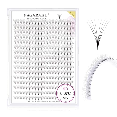 NAGARAKU 9D Förgjorda Volymfransar 320 Fans Volym Premade Fans Lång Stjälk Tunn Bas Spets Naturliga Fluffiga Fächer Fransar Fransförlängning Ögonfrans Ryska Svart 16 Rader Box XL (0.07 C 9-14mm)
