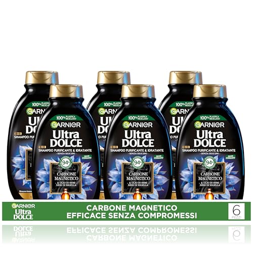 Garnier Ultra Dolce Magnetiskt kol, Multi Pack x6 Fuktgivande och renande schampo, 94% naturligt ursprung, för fet hud och torr längd, silikonfri, 300 ml