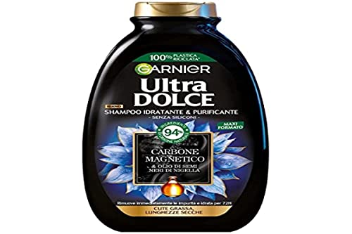 Garnier Ultra Dolce Magnetiskt kol, fuktgivande och renande schampo, 94% naturligt ursprung, för fet hud och torra längder, silikonfri, 300 ml