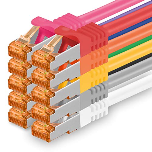 1aTTack.de 5 m – Cat.7 nätverkskabel 10 färger – 10 stycken Gigabit Ethernet LAN-kabel 10 000 Mbit s patchkabel Cat7 kabel S FTP PIMF avskärmning LSZH Cat.7 råkabel Rj45 kontakt Cat 6a – 10 x 5 meter