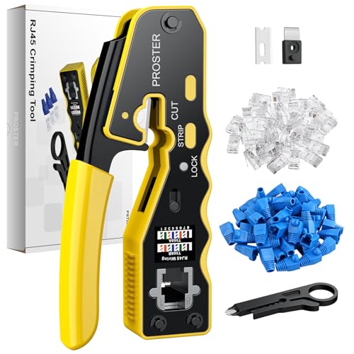 Proster RJ45 crimptång nätverkskabel tång kontakt nätverk verktyg för RJ45 Cat6 Cat5 Cat5e med 50 stycken Cat6-genomströmningskontakter och skyddskåpa, 1 st trådskärare-gul