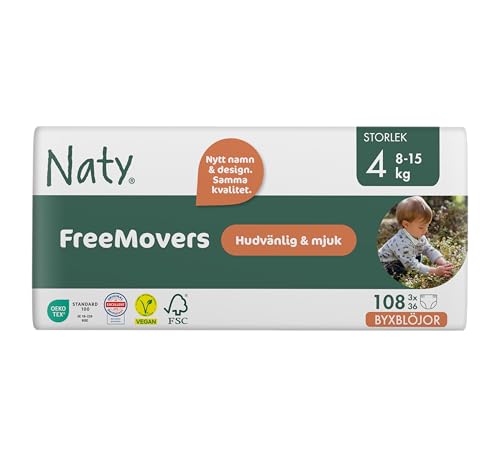Naty FreeMovers Byxblöjor | Certifierade för Känslig Hud | Mjuka, Oparfymerade, för Potträning | Absorberande & Läckagesäkra | Baby & Barn | Storlek 4 (8–15 kg), 108-pack