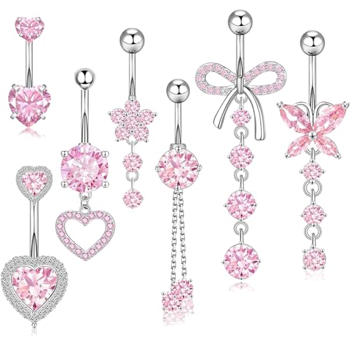 Irikdescia 7 stycken långa navelpiercing set, kirurgiskt stål silver rosa, hängande fjäril och hjärta design, blomma navelpiercing, navelpiercing set