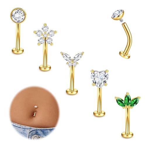 MILACOLATO 5 stycken 14 g navelpiercing kirurgiskt stål 316L navelpiercing guld/silver fjäril navelpiercing kort stavlängd 10/12/14 mm piercing navelsmycke, 14MM, Kirurgiskt stål med gulddekoration
