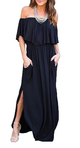 Womens Summer Casual Style Off The Shoulder Ruffle Party Längd Klänningar Side Split Beach Maxiklänning(Navy Blue,XXL)