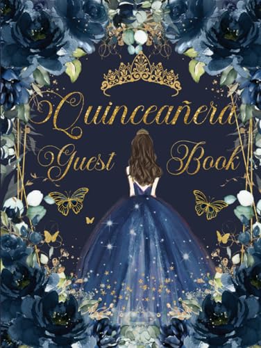 Quinceanera Guest Book Hardcover Navy Blue Floral Flowers Princess Dress Gold: Mis Quince Años ( Sweet 15 Birthday) Keepsake Memento Guest Messages and Memories