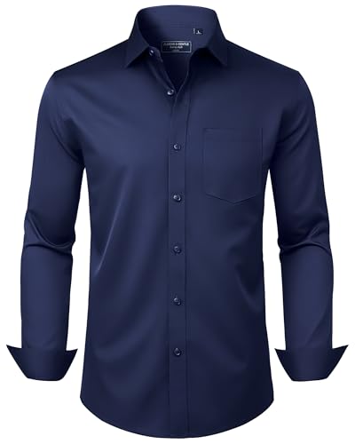 Alimens & Gentle Mens Dress Shirts Long Sleeve Wrinkle Free Stretch Business Casual Button Down Shirts Navy Blue Large