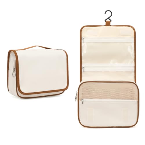 Kono Hängande necessär för resor för män och kvinnor, vattentät multifunktionell toalettartiklar sminkväska med hängande krok, sminkväska för kvinnor i full storlek behållare, Beige och brun,