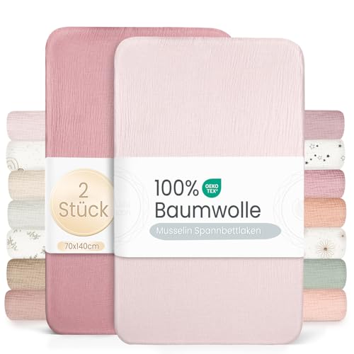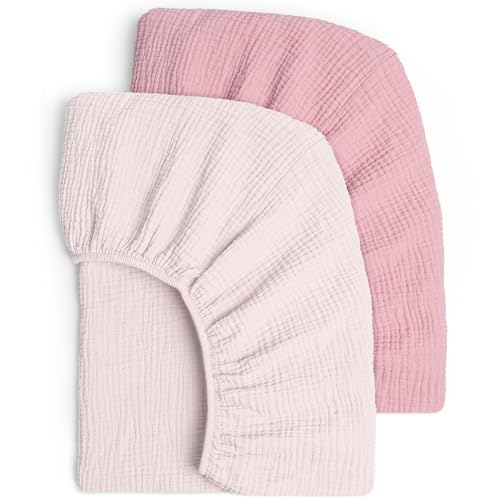 Uppsättning av 2 barndra-på-lakan, muslinbomull dra-på-lakan för barnsäng och barnsäng 60 x 120 cm/70 x 140 cm resesäng, dra-på-lakan sidosäng, linnedukar (rosa nejlika)