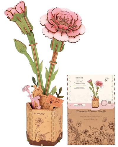ROWOOD 3D-pussel rosa nejlika, gör-det-själv-blomma av trä, modellbyggsatser för konstgjorda blommor att montera för vuxna, bästa heminredning och alla hjärtans dag leksaks-presentset
