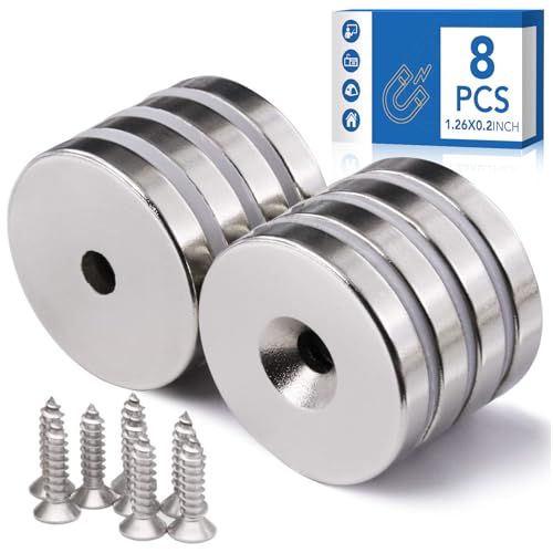 LOVIMAG 1.26 inch x 0.2 inch Neodymium Disc Countersunk Hole Magnets. Strong Permanent Rare Earth Magnets with Screws - Pack of 8