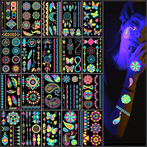 ACWOO Neon tillfälliga tatueringar, 20st 200+ flera mönster Glow in the Dark Neontatueringar, Flash UV Neon Fake Vattentäta tatueringsklistermärken Rave Festival Accessoarer för kvinnor Flickor Festtillbehör (20st)