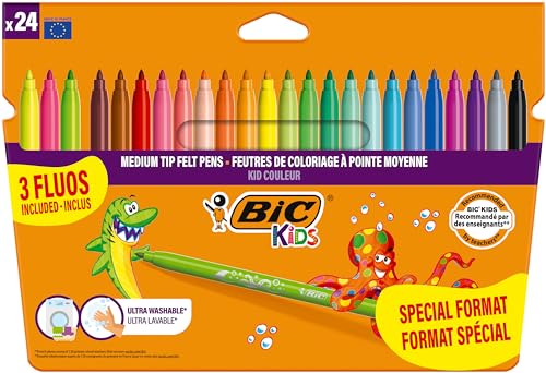 BIC barn fibermålning Kid Couleur, 24-pack, tvättbar barn-filtpenna, inkl. Neonfärger