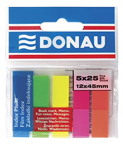 DONAU 7577001PL-99 index flikar klistermärke bokmärke klisterremsor/minifästmarkör av 60 μm PP-folie/ 12x45 mm, 5 x 25 stycken, textmarkörremsor beskrivbar/olika neonfärger