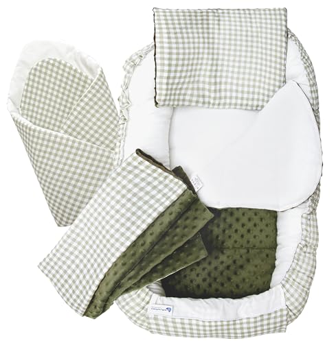 Medi Partners Babynestset för nyfödda - 100x60x15 cm 5-delat bärbart nest vändbart 100% bomull (Rutig med olivgrön Minky)