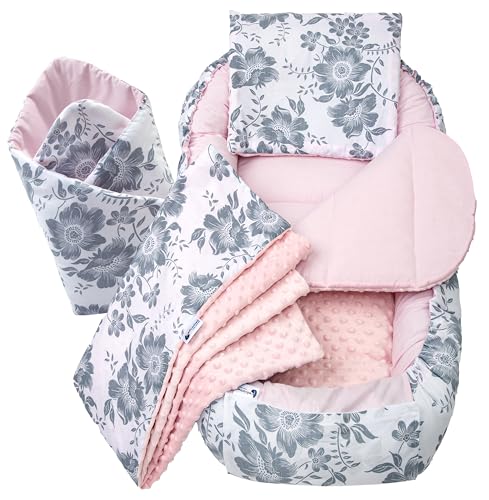 Medi Partners Babynestset för nyfödda - 100x60x15 cm 5-delat bärbart nest vändbart 100% bomull (Blommor med ljusrosa Minky)