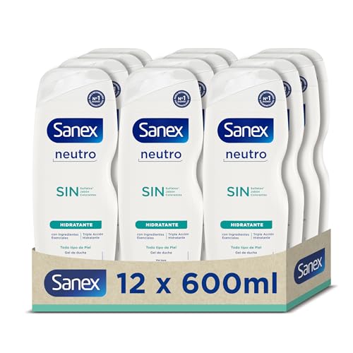 Sanex Neutral fuktgivande duschgel 600 ml, 12-pack, med väsentliga ingredienser, 0% sulfater*, 0% tvål och 0% färgämnen, för alla hudtyper, långvarig hydrering, trippelverkande teknik