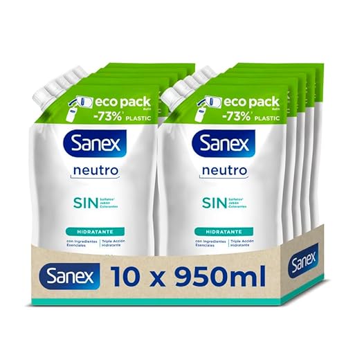 Sanex - Återfyllning av neutral Sanex duschgel fuktgivande 10 x 900 ml | Med väsentliga ingredienser | 0% sulfater*, 0% tvål och 0% färgämnen | Duschgel alla hudtyper | långvarig återfuktning