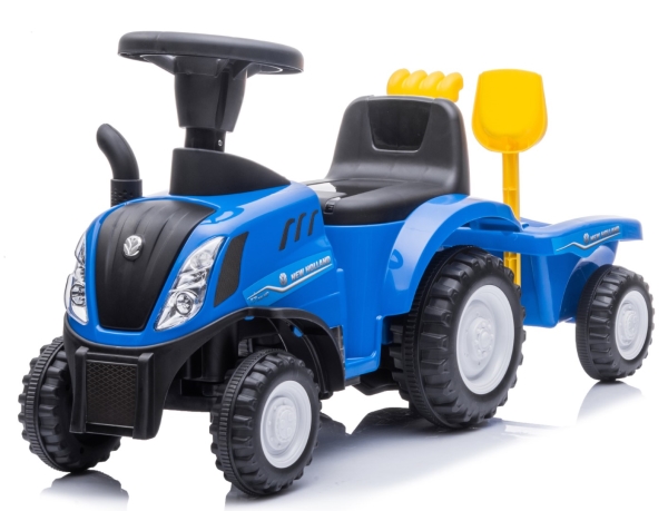 Glidare New Holland T7 Traktor – från 12 månader, sitthöjd 270 mm, tippskydd, originaltroget utseende, släpvagn med spade och kratta, LED-ljus
