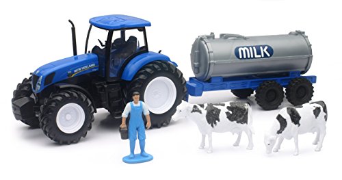 New Ray – Traktor New Holland t7.270 Citerne a Lait med 1 personalisering och 2 vaches, 05523 A, grön