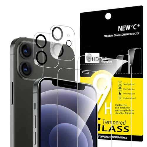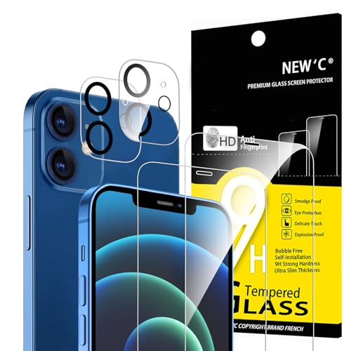 NEW'C Set med 4, 2 x Skärmskydd för iPhone 12 och 2 x kameralinsskydd i härdat glas - Fri från luftbubblor - Ultrabeständigt - 9H hårdhetsglas