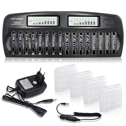 CITYORK 16 fack AA/AAA NiMH Smart batteriladdare inbyggt IC-skydd – med urladdningsfunktion och LCD-skärm – med 8 av 3 000 mAh AA och 8 med 1 100 mAh AAA högkapacitetsbatterier