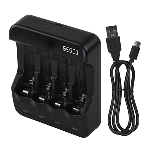 EMOS Batteriladdare för 4 celler, 300 mA, universell NiMH, NiCd batteriladdare för 1–4 x AAA, AA, USB/mikro-USB-kabel 60 cm, LED-skärm, batteriskydd, säkerhetsfunktioner