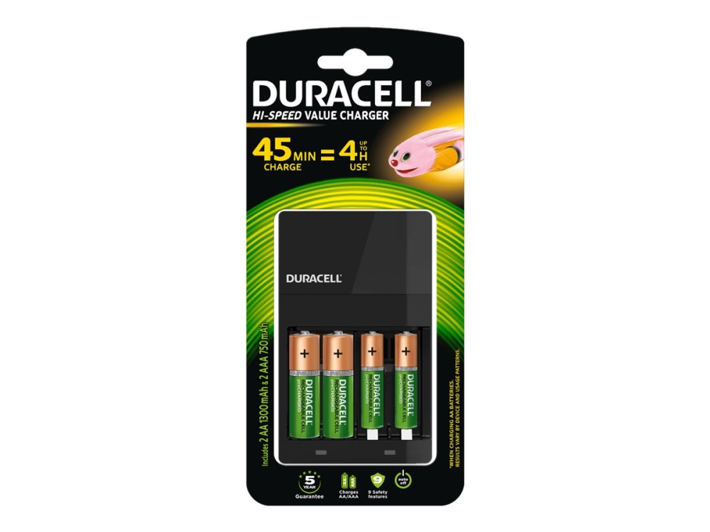 Duracell High-Speed Value Cef14 - 4 H Batteriladdare - (För 4Xaa/Aaa) 2 X Aa-Typ - Nimh - 1300 Mah - 7 Watt - Med 2 X Aaa Nihm 750 Mah Laddningsbara Batterier