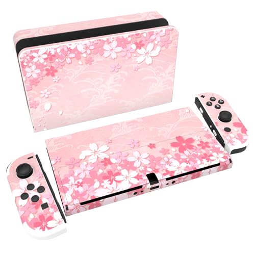 PlayVital Klistermärke för Nintendo Switch OLED,Anti-repor Skydds Hudklistermärke för Switch OLED,Skins Stickers Hud Skyddande för Switch OLED-Konsole & Joycon & Dock & Grip-Rosa Körsbärsblomma