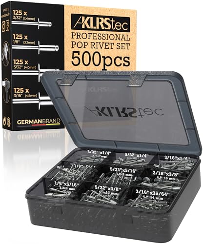 KLRStec Professional blindnitar set 500 delar av aluminium och stål, popnitar för nittång, 125 stycken per storlek 2,4 mm, 3,2 mm, 4,0 mm och 4,8 mm