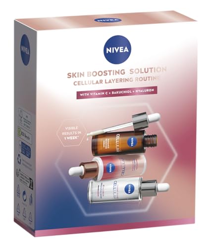 NIVEA Cellular Skin Boosting Solution Set, ansiktsvårdsset med C-vitamin serum, hyaluron serum & bakuchiol ansiktsserum, för en effektiv lyfteffekt (3 x 30 ml)
