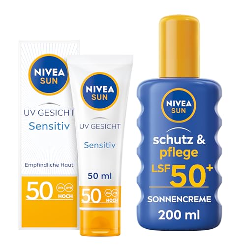 NIVEA SUN Set med NIVEA SUN UV ansikte känslig solskydd SPF 50 och skydd & vård solskyddsmedel Spray SPF 50+, parfymfri ansiktskräm med SPF, omedelbart effektiv och vattentät solkräm
